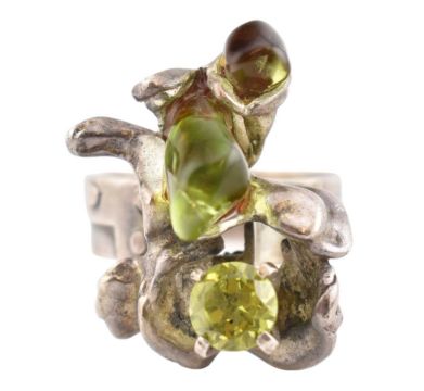 Collection of silver and white metal jewellery. The jewellery to include a Victorian hallmarked silver locket. A brutalist bracelet. A silver and peridot ring, stamped 925, two silver gem set rings stamped 925. Two pendant necklaces one with Italian marks 925. Total weight 98g