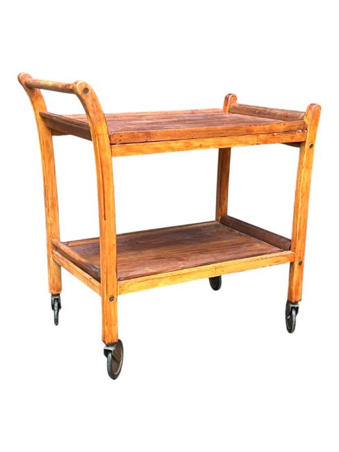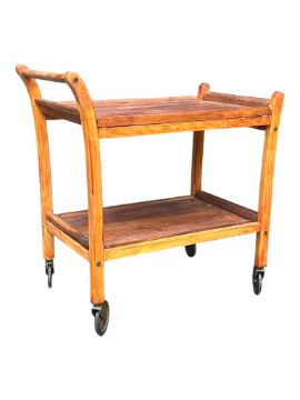 British Modern Design - A mid century teak wood butlers trolley. Raised on squared legs with twin tiers and handle to one side. Measures approx: 73x69x40cm