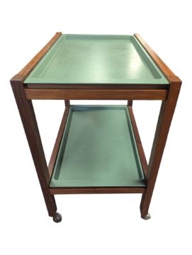 British Modern Design - Teak mid century Air Ministry government issued hostess tea trolley. Rectangular form with two tiers having removable trays. Raised on upright supports with castors. Stamped to base reading Glenister Dec 1975 7105 89 127 8231 with the broad warhead arrow.