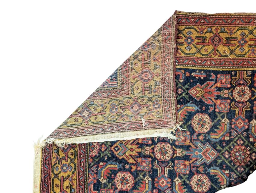 A vintage 20th century Persian Islamic carpet floor runner rug. Central blue ground panel with repeating floral design, encapsulated a floral repeating pattern border with tassels to ends. Measures approx: 450x97cm