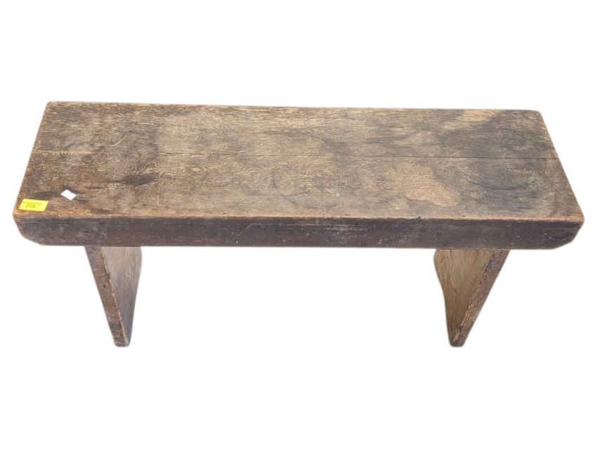 A rustic 19th century vintage pine farmhouse pig bench. The top of plank form being raised on angled trestle supports. Measures approx: 43x87x27cm