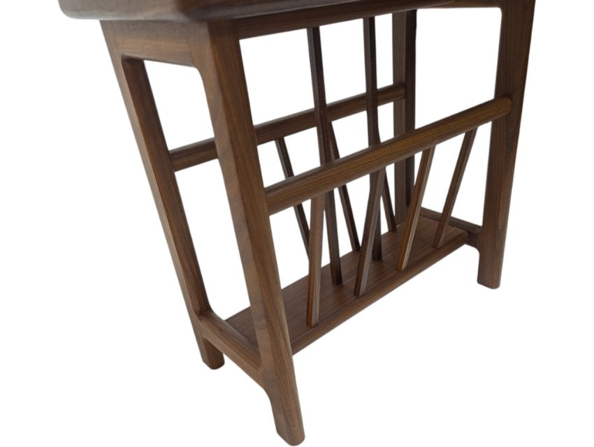 British Modern Design - Two vintage 20th century teak coffee / occasional tables. Tile top on teak construction frame with magazine rack on trestle legs. Measures approx: 40x85x45cm