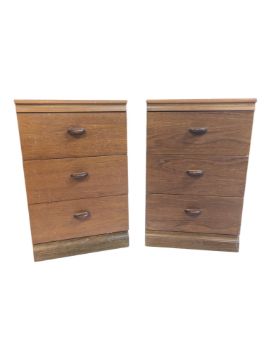 Meredew Furniture - A pair of mid century teak bedside tables / chest of drawers. Having a bank of three drawers raised on a plinth base with pull handles. Measures approx: 67x43x42cm