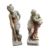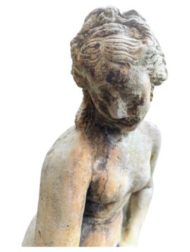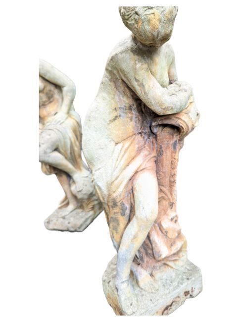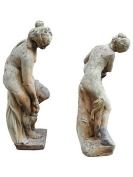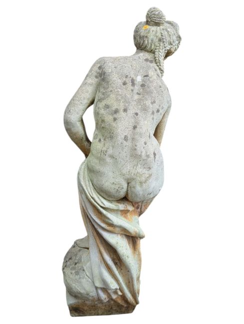 Two reconstituted garden outdoor stone semi nude statues. Two ladies bathing with water jug and draped clothes. Both raised on plinth base. Measures approx: 82x28x28cm