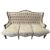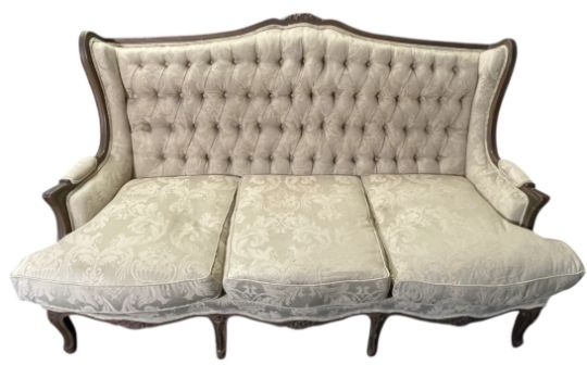A large French Louis XV style 19th century button back three seater sofa/settee. Solid carved walnut frame with reeded borders and carved foliate legs. Button back rest with drop-in cushioned seat in damask upholstery fabric.