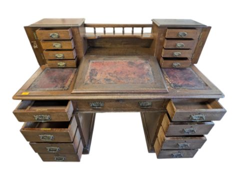 A Victorian 19th century oak twin pedestal Dickens desk / writing table. The desk having a raised galleried back flanked by two banks of drawers with Wellington style locks. Flip top burgundy leather writing skiver below flanked by further leather panels. All raised on pedestals each with three drawers and brass swing handles, all raised on castors. Measures approx: 107x132x64cm