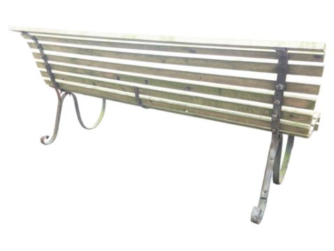 Wrought iron 20th century strapwork garden bench. The bench with a slatted wooden seat. Measures approx: 83x180x80cm
