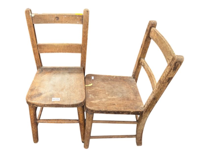 A set of three early 20th century beech and elm children's chairs. Each having beech frames with ladderback backrests and elms seats. Each raised on turned legs united by stretchers. Measures approx: 67x34x38cm