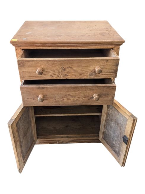 A 19th century Victorian pine cabinet. The cabinet having a bank of two drawers, over a twin door cabinet each with fielded panel doors, raised over a plinth base. Measures approx: 107x80x56cm