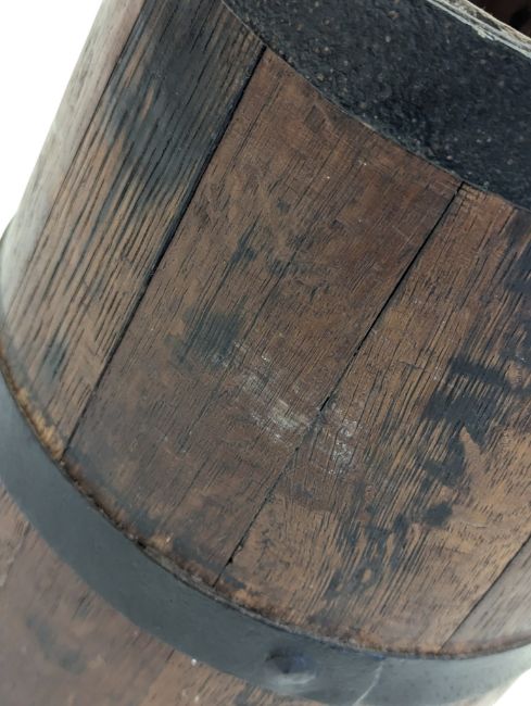 Early 20th century barrel form stick / umbrella stand. Ebonised metal rings supported planked wood body on a circular foot. Measures approx: 48x26cm