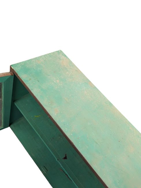 Early 20th century pine bookcase haberdashery shop cabinet. Large rectangular form with four glazed front cabinet doors with wooden shelves within, painted in green colourway. Measures approx: 75x199x34cm