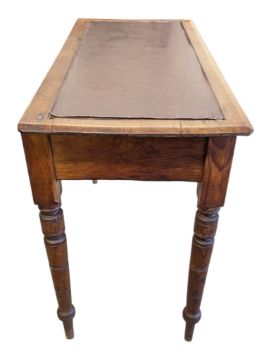 A 19th century Victorian pine writing desk. The desk having red inlaid leather skiver to top over twin drawers, each with glass handles, raised over turned supports. Measures approx: 73x104x46cm