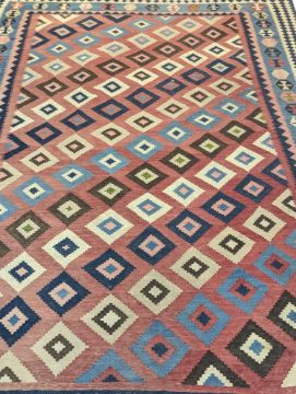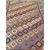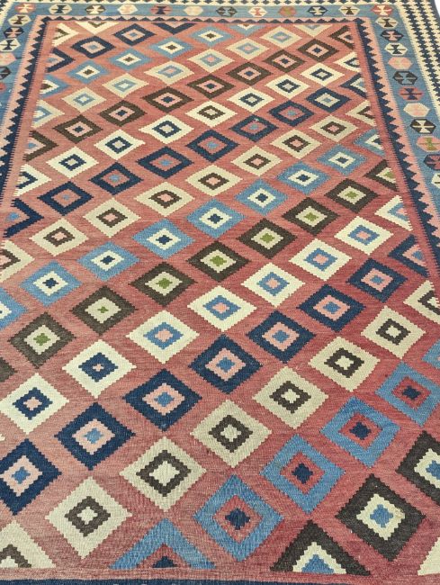 A 20th century Turkish kilim wool rug carpet. The rig having geometric patterning in shades of blue, red, pink and cream with tasselled ends. Measures approx: 295x210cm