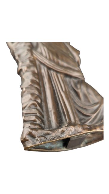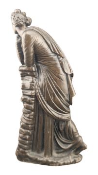 After Ferdinand Barbedienne - 20th century bronze figure of the Greek Muse of sacred poetry, hymns, eloquence, and pantomime, Polymnie (or Polyhymnia). Marked to the base 'Barbedienne'. Depicting a woman draped in a robe and leaning on a stone pile. Measuring approx. 16cm tall.
