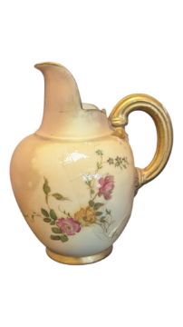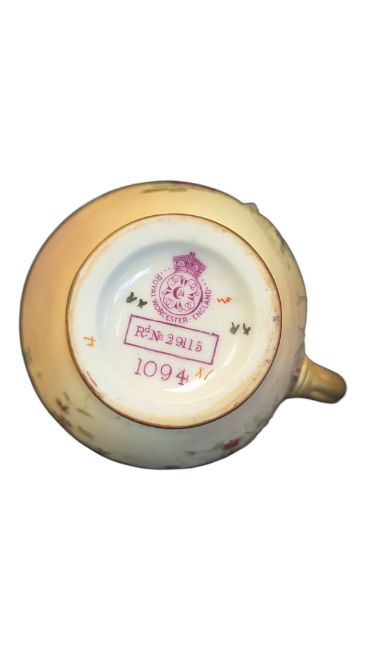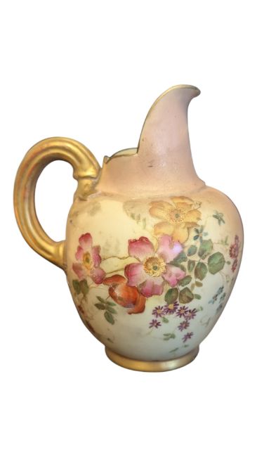 Royal Worcester - 19th century ivory blush porcelain hand painted jug. Featuring gilt handles, rim and foot with floral decoration. Makers mark to the base. Measuring approx. 12.5cm tall.
