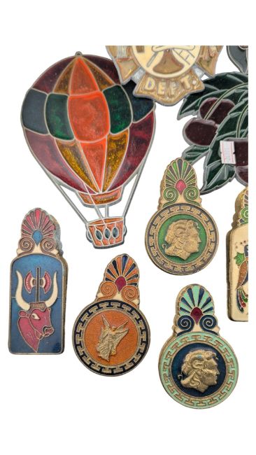 Collection of late 20th century Greek & Egyptian themed brass with enamel letter clips. Alongside a selection of polychrome suncatchers. Letter clips including decorations such as a Cretan bull, a Roman bust, The Tortoise and The Hare, Owl of Athena, and more. Comprising of eight letter clips and six stained glass style suncatchers. Largest piece measuring approx. 18.5cm in length.