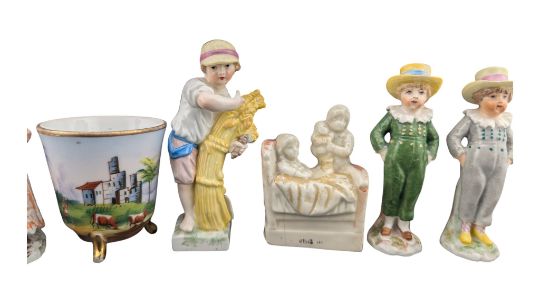 A collection of 19th century Staffordshire and other china figures. To include a KPM Berlin figure of a farmer boy, a Fairing Gift figure, a Victorian dressed figure of a girl, a hand painted coffee cup, and a selection of child figures. One figure af. Largest measuring approx. 10cm tall.