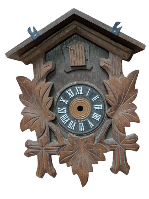Two 20th century West German Black Forest style wooden cuckoo clocks. One comprising the clock case only, with a white painted Roman numeral chapter ring surrounded by carved leaves. The other containing the clock mechanism and cuckoo within the door, also with a white painted Roman numeral chapter ring and foliage carvings. Weights missing. Largest measuring approx. 22cm x 16cm x 13cm.
