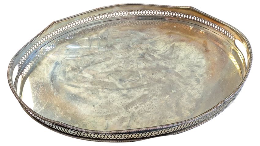 Three early 20th century silver plate serving platters, cloch. Including Henry Turner, Paddington - oval example with raised pierced surround and Elkington lidded fish oval dish. 51cm x 40cm approx.