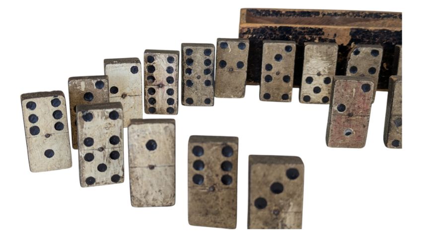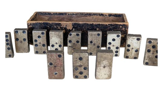 An early 20th century table top set game of dominoes. Including all 28 tiles on block wood with painted tops and black circular pips.
