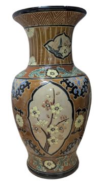 Large Chinese earthenware baluster vase. Including panelled scenes of different flowers and foliage, surrounded by foliate motifs and geometric borders. In a brown, green and yellow glazed colourway. Numbered 170 to the base. Measuring approx. 51cm tall.