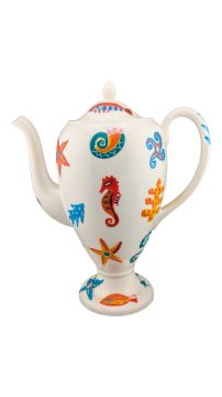 Repeat Repeat - Contemporary china Neptune patterned coffee pot and two mugs. Decorated with illustrations of sea life in a polychrome colourway on a white ground. Makers marks to the bases. Coffee pot measuring approx. 25.5cm tall.