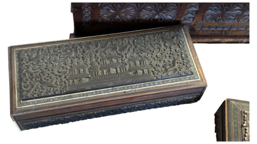 A large 20th century carved hardwood dome top casket chest. Each panel with carved decoration. Together with two relief carved Indian casket boxes, bone inlaid panelling detail remaining. Large chest measures 23cm high x 38cm wide (3)