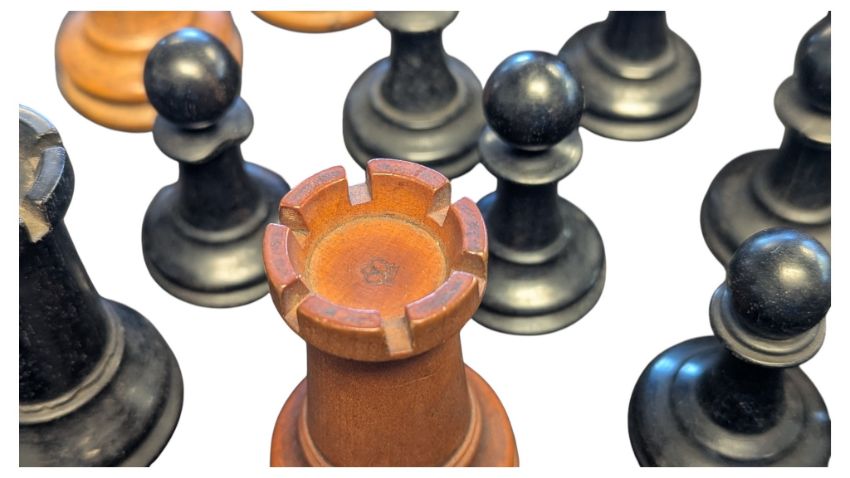 Jaques of London, Staunton Chessman Set - A 19th century boxwood chess set. Including Kings, Queens, Rooks, Bishops, pawns and knights. Some pieces with marks, not all the pieces match, sold as seen. With walnut box. 11cm height King