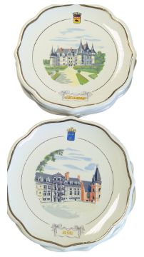 Gien, France. A collection of vintage 20th century French ceramic wall / display plates. Depicting French architectural buildings including Elois, Gien, Cheverny, Villandry, and many other examples. 18 in total including some duplicates. Together with a large serving platter example. Maker's mark to underside. Chateaux de la loire modele reserve.