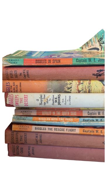 Biggles - W. E. Johns - a collection of vintage titles including Biggles And The Poor Rich Boy, Biggles Sets A Trap, Biggles Delivers The Goods, and many others. Hardcover and soft backs. (19)
