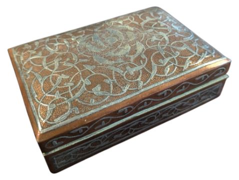 A collection of 20th century brass and copper items. The collection includes an Arts and Crafts repousse brass charger, a large brass foliate engraved charger, a pair of 1934 German Art Nouveau vases, a copper and brass repousse jug, an Arts and Crafts copper repousse decorative panel, and a floral inlaid metal lidded box. Makers stamps to the underside of some of the pieces.