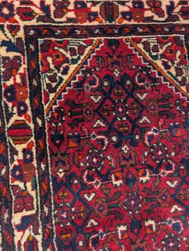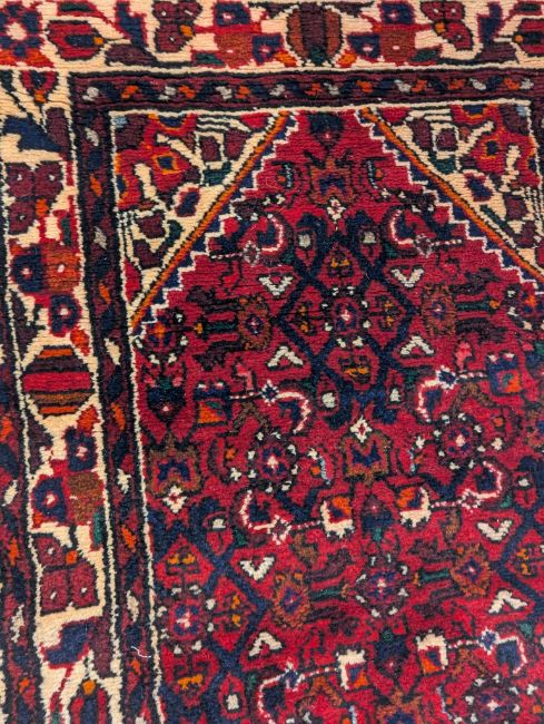 A vintage 20th century north west persian maylayer runner rug. Central diamond medallion to a deep red central field. With varying size repeating pattern borders. Measures approx: 298x80cm
