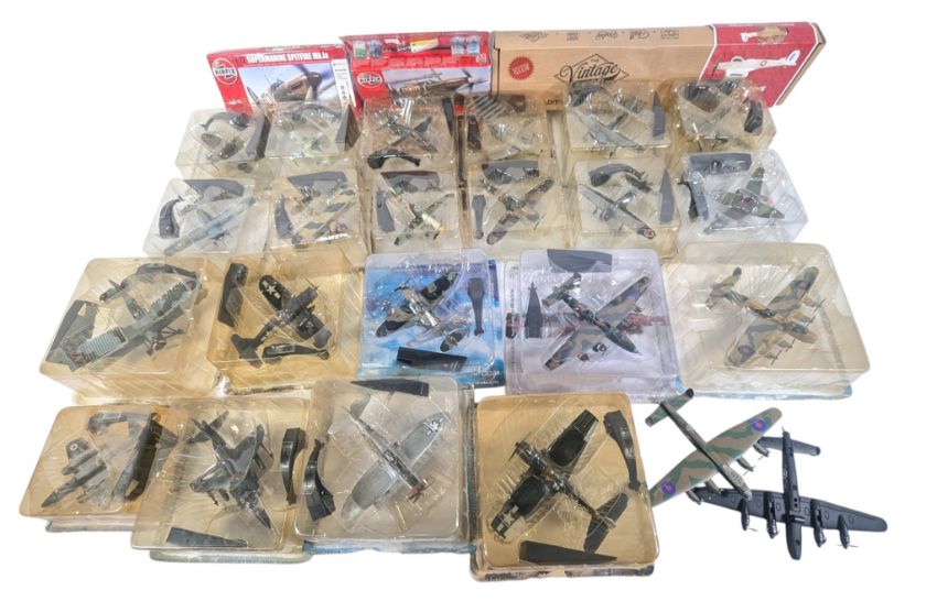 Diecast - a collection of x24 Amercom made aviation interest diecast military WWII World War Two and other model aeroplanes, of various scales primarily 1/72 scale, together with x3 Airfix and other aviation model kits. To include; 1944 Handley Page Halifax B. MK.11, 1941 Supermarine Spitfire MK Vb, 1954 MiG-15bis, 1984 British Aerospace Hawk, and other. All but 2 in their original packaging, though several lacking cardboard backing.