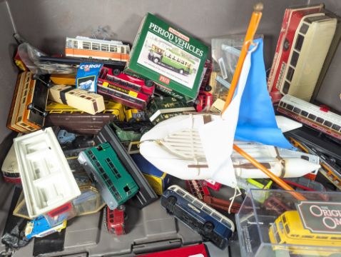Diecast - a large assorted collection of Corgi and other diecast and plastic model vehicles of various scales, including buses, planes, trams, boats, public transport, advertising interest and other. To include; The Original Omnibus, x4 boxed Corgi Tramlines, Condor Car Carrying Wave Piercer, Oxford Diecast 1/76 scale model car, Plastigam of Norev, Rietze Automodelle, Atlas Editions Silver Classics planes, Solido and other. Several in original boxes, others loose. Approx. 50+ models.