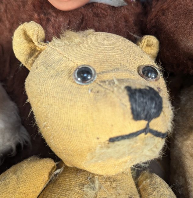 Bears - a collection of vintage soft toy jointed teddy bears, together with a Chad Valley Hygienic Toys Push Along Horse. To include; Gabrielle Designs Paddington Bear No. 957892 (lacking outfit), a monkey/chimp, a dog, and x3 jointed vintage teddy bears with embroidered noses, and blonde mohair.
