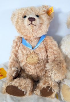 Bears - x4 2000-2003 German Steiff Danbury Mint collaboration soft toy bears, No. 654756, 660344, 654701, and 660931, with their original certificates. The bears having golden and white fur, jointed limbs, embroidered noses, yellow tags and gold buttons to the ears, and with their original Danbury Mint coin medallions on ribbon around their necks.With x2 original Steiff bags.