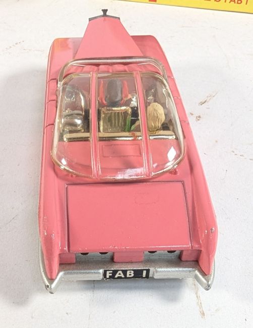 Diecast - an original vintage Dinky Toys diecast model No. 100 Thunderbirds Lady Penelope's FAB 1 car with Penelope and Parker figure, operating sliding cockpit, x4 rockets and x1 harpoon. Housed in original box with insert display.