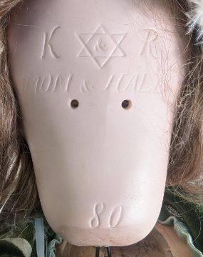 Dolls - an antique German Simon & Halbig K&R bisque headed doll, with 'Simon & Halbig K&R 80' impressed to the rear of the head. The doll having brown flity eyes, finely painting eyebrows, lashes and lips, brunette hair, and jointed limbs. Measures approx. 82cm. Appears to have no major cracks to the head, chipping to the paint to the left hand, with all fingers present.