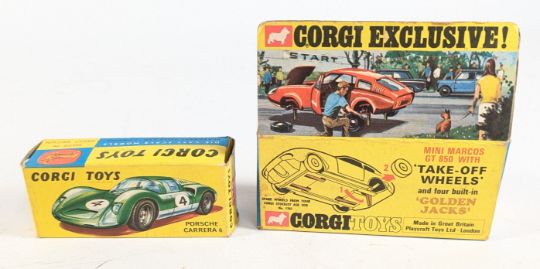 Diecast - x2 vintage Corgi Toys boxed diecast model cars to include; No. 330Porsche Carrera 6 with opening rear end and driver figure together with No. 341 Mini Marcos GT 850 with built in jacks and take off wheels.