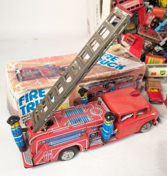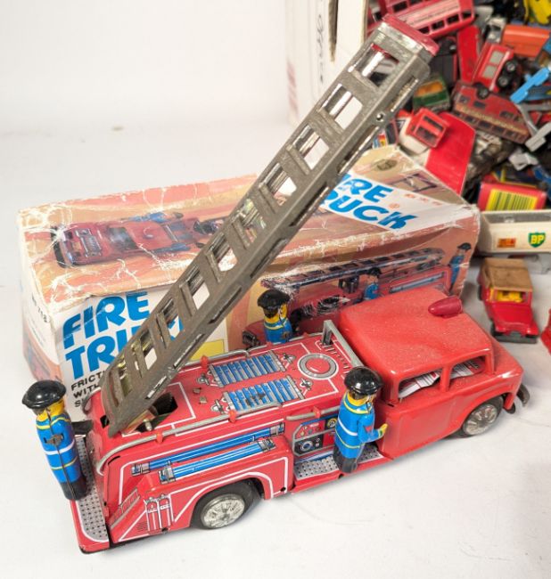 Diecast - a collection of vintage diecast model cars and other vehicles of various scales and makers to include; Matchbox, Majorette, Cararama, Corgi Mr Bean's Mini and others together with Scalextric parts / spares / repairs, Airfix 1/32 scale Lotus Cortina and a tinplate Fire Engine.