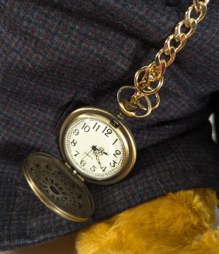 Bears - an original Amy Goodrich artist soft toy jointed artist teddy bear (Portobello Bear Company). The bear is named 'Lord Hammersmith' and is a one of a kind bear, with original swing tag inscribed by the artist Amy Goodrich. The bear has golden fur, a long snout, fabric paw pads, a paisley scarf to the neck, and is outfitted in a navy checkered suit jacket with a pocket watch to the pocket. Measures approx 70cm.