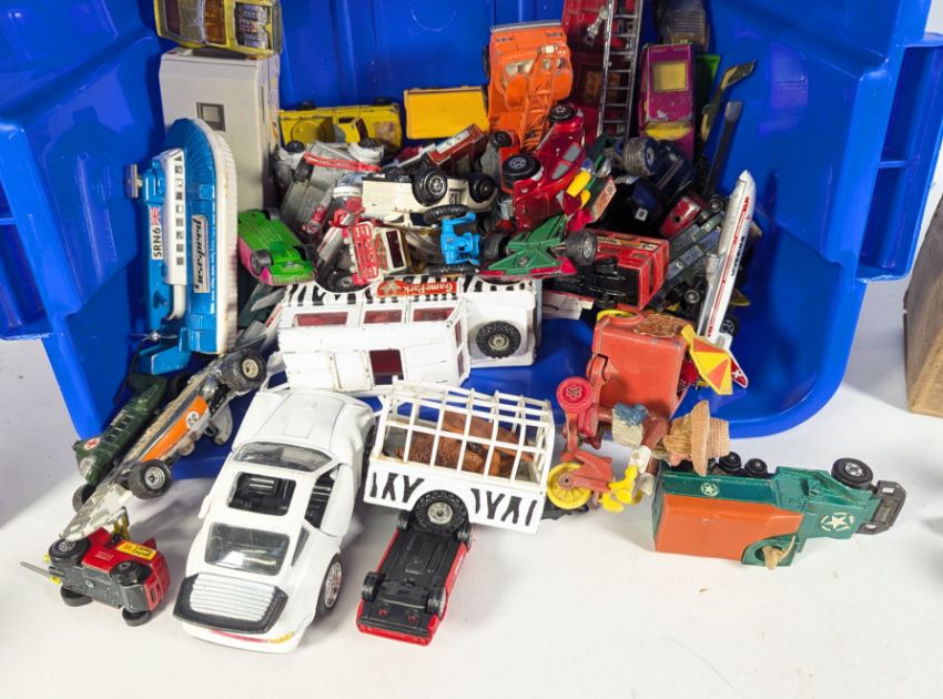 Diecast - a collection of assorted diecast model cars and other vehicles of various scales and makers together with x2 boxed Astra military models (Pom Pom Gun & Search Light. Diecast cars to include; Corgi Toys Formula One, Dinky Toys Lunar Landing Vehicle, Matchbox and others.