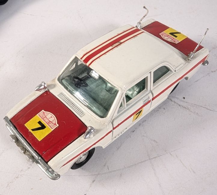 Diecast - a collection of vintage Dinky and Corgi Toys diecast model cars and other vehicles to include; boxed 155 Ford Anglia, boxed 205 Lotus Cortina Rally Car, Corgi Toys Citroen Safari with skier, Corgi Toys Campell Bluebird landspeed car and others.