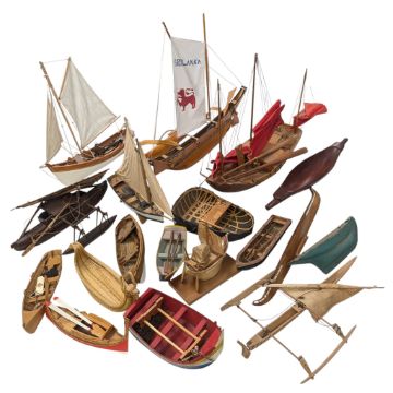 Model Ships - a large collection of assorted wooden scratchbuilt and other model ships, boats, canoes and other watercraft. To include examples of a Sri Lankan Oruwa Oru, outrigger canoe, row boats, sailboats, Reed Boat, a clay handcrafted model boat, and others. x18 models present. Largest measures approx 80x57cm, smallest measures approx 20x20cm.