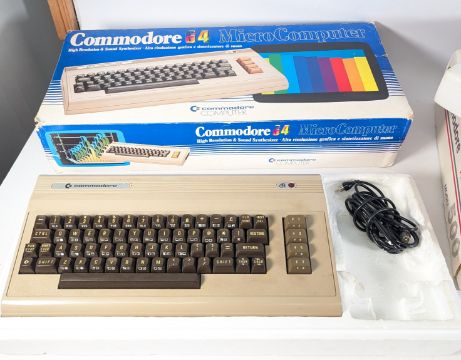 Retro Gaming - a vintage 20th century Commodore Amiga Model 500 computer, together with a Commodore 64 Microcomputer, with Commodore Datasette. Both in their original box with manuals.