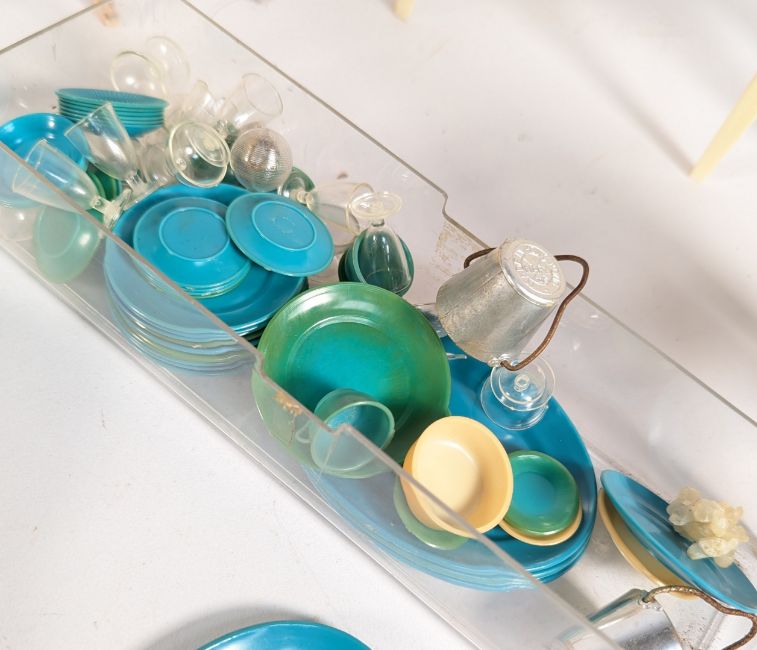 Barbie - a collection of original 1960s vintage Mattel Barbie Susy Goose & other furniture and a selection of accessories. To include; the Susy Goose French Provincial Vanity and stool, a Marx Toys 'Little Hostess Buffet' side table, a Sindy Scenesetters bedside table, and other. Together with a selection of accessories such as cutlery, cups, plates, pots, and other.
