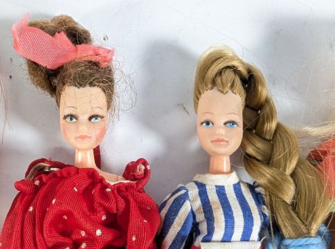 Pippa - a collection of vintage 1970s-1980s Palitoy Pippa fashion dolls, including x3 No. 2 dolls with '2' impressed to the rear of the head which appear to be Pippa, Penny and Britt, and a No. 3 doll which appears to be Tammie. The dolls having rooted lashes, blonde, brunette and red hair and blue eyes. Together with a selection of assorted clothing such as dresses, aprons, and other.