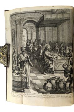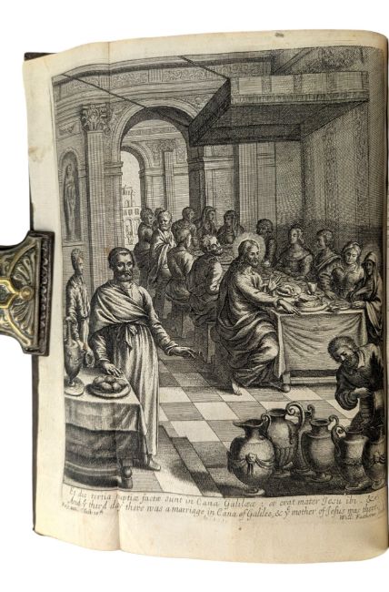 Split into three parts, each with its own title page in red and black, reading The History of the Life and Death of the Holy Jesus, with each covering a different period of Jesus's life. Illustrated with an engraved frontispiece and ten engraved folding plates. Bound in full calf with gilt detailing. With the bookplate of Mervin Harvard-Brown. (1)