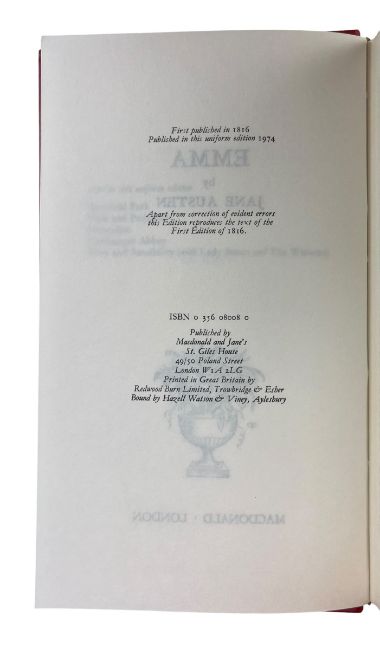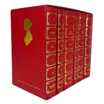 Austen, Jane. 1974 The Novels of Jane Austen. London: Macdonald. Published as part of the Macdonald Classics series. Uniformly bound in red leather-imitation cloth with gilt detailing, housed in the original slipcase. Comprised of Pride and Prejudice, Persuasion, Sense and Sensibility, Emma, Northanger Abbey, and Mansfield Park. (6)