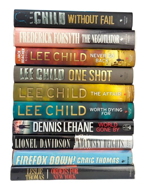 Modern first edition novels. A collection of c.40 modern first edition novels from authors including Wilbur Smith, Frederick Forsyth, Hammond Innes, Eoin Colfer, Craig Thomas, Lee Child, John Grisham, Robert Harris, James Elliott, and others. Titles include The Negotiator by Frederick Forsyth, Rage by Wilbur Smith, The Brethren by John Grisham, Finders Keepers (Collector's Edition) by Stephen King, Medusa by Hammond Innes, Firefox Down! by Craig Thomas, and many others. Each is in very good condition, with the original dust wrapper. Signed by the author to Without Fail. Together with seven early impressions/reprints, including John Le Carre, James Clavell, John Steinbeck, Wilbur Smith and Owen Matthews. (c40 first editions & 7 reprints)
